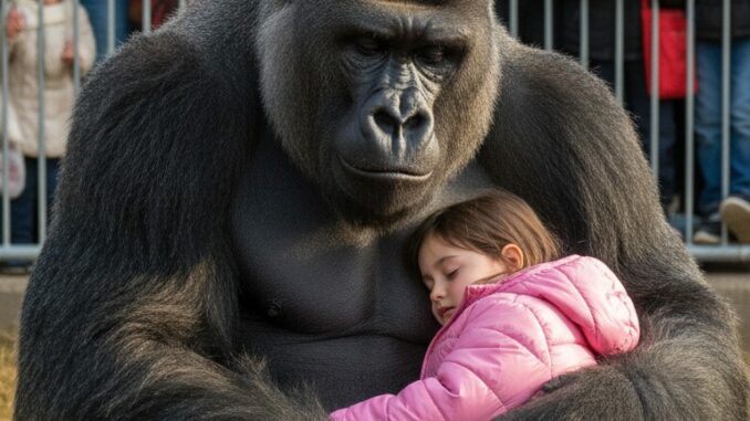He approached the terrified child, then did the unexpected: he sat beside her. Calm. Protective. When younger gorillas stirred, he positioned himself between them and Maya, shielding her from harm.