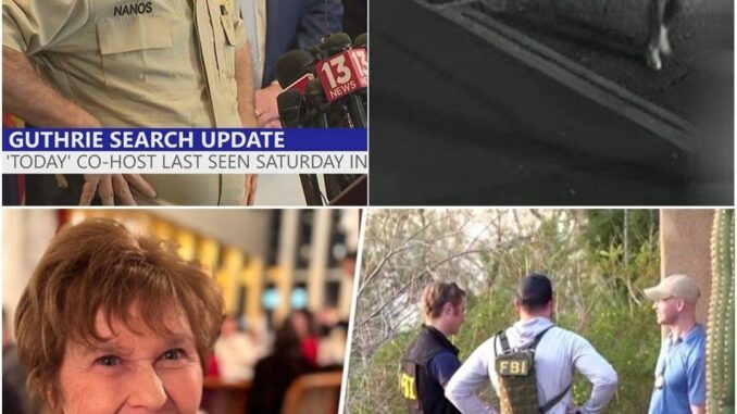 In the confirmed timeline, 84-year-old Nancy Guthrie vanished early February 1 from her Catalina Foothills home. Authorities found signs of forced entry, blood inside, and a disabled security camera. Her phone, wallet, car, and medications were left behind — indicating she did not leave voluntarily.