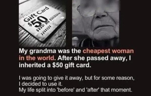 After she passed, I received a $50 gift card from her. At first, it seemed impersonal, until a store manager revealed its secret: Grandma had been one of the store’s “Silent Angels,” quietly buying gift cards for people in need without ever taking credit. The card I held was her last act of anonymous generosity.