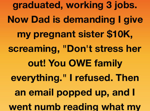 My parents never saved for my college, so I worked three jobs to graduate, believing we were struggling together. Years later, as an engineer saving for a house, my dad demanded I give my pregnant sister $10K, saying I “owed” family everything. I refused.