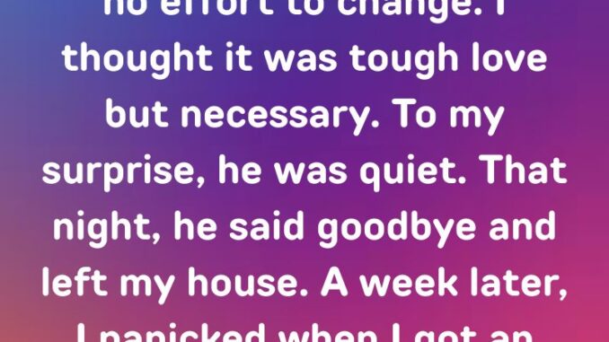 I rushed there. He looked pale and ashamed. When I asked why he hadn’t stayed with a friend, he said, “I didn’t want to be anyone’s burden anymore. Not even yours.”