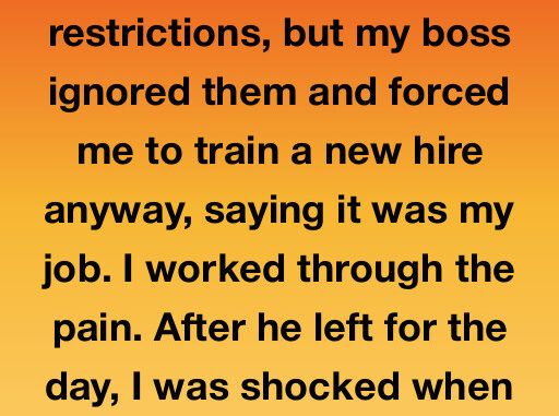 I returned to work after major abdominal surgery, with strict medical restrictions, but my boss, Sterling, ignored them and forced me to train a “new hire.” I spent six grueling hours on my feet, in pain, hiding the fact I was risking my health.