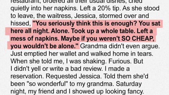 I decided to respond thoughtfully rather than react angrily. The next night, I returned to the restaurant, ordered generously, and handed the waitress an envelope with messages like, “She’s a widow, not a wallet,” explaining how her words had hurt my grandma.