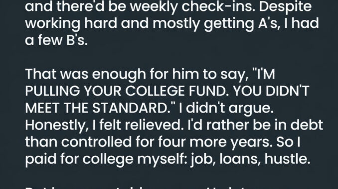 My dad was strict: no grades below a B, every class pre-approved, weekly check-ins. I worked hard and mostly got A’s, but a few B’s were enough for him to say, “I’m pulling your college fund. You didn’t meet the standard.”