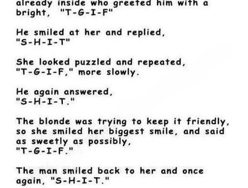 “‘T-G-I-F’ means Thank God, It’s Friday!”