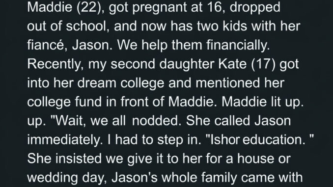 Recently, her sister Kate got accepted to college and mentioned her fund, which surprised Maddie. She assumed hers could be used for a house or wedding, but we explained it was strictly for education. Maddie’s fiancé Jason and his family then pressured her to hand over the money, showing entitlement and manipulation.