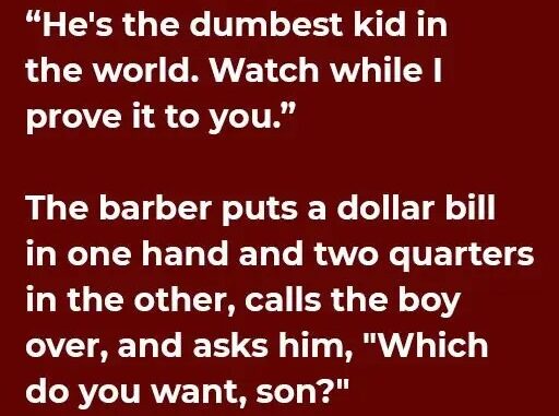 A barber tells a customer a boy is the dumbest kid ever. He offers the boy a dollar or two quarters. The boy takes the quarters.