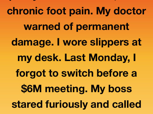 Later, my boss, Mr. Sterling, revealed he’d been hiding slippers under his desk for years due to his own foot pain. Seeing me in slippers reminded him—and the client—that professionalism isn’t about shoes but confidence and competence.