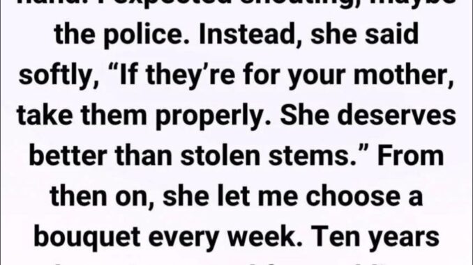 Ten years later, I returned to the same shop to buy flowers for my wedding. When I mentioned the little girl she once let take flowers for her mother’s grave, she realized it was me. With tears in her eyes, she told me she had known my mother, who used to buy daisies there every Sunday.