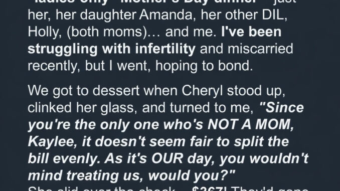 Throughout the meal, Cheryl celebrated the “real moms,” gave them gifts, and completely excluded Kaylee. When the bill arrived—$367—she pushed it toward Kaylee, calling it her “gift” to the mothers.