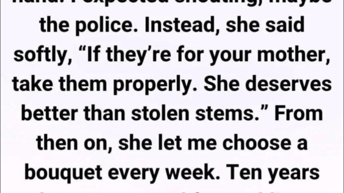 From then on, I visited the shop every week after school and chose flowers for my mother’s grave. She never charged me and often added an extra flower, saying, “Your mother had good taste.” The shop became my quiet refuge during a difficult time.