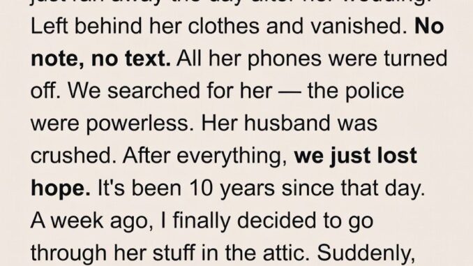 A decade later, while sorting old boxes in the attic, I found a letter in Laura’s handwriting addressed to me. In it, she revealed she had been pregnant before the wedding and felt she couldn’t stay. Afraid and overwhelmed, she chose to leave and start a new life.