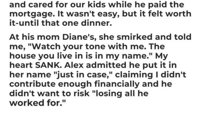 Jennifer discovered her husband Alex had secretly put their house in his mother Diane’s name, showing he didn’t trust or respect her. Though hurt, she stayed calm and quietly planned her future, saving money and securing a backup home for herself and her kids.