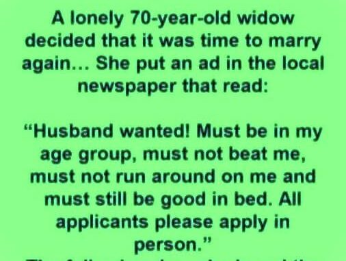 A lonely 70-year-old widow placed a newspaper ad seeking a loyal, gentle, and passionate husband.