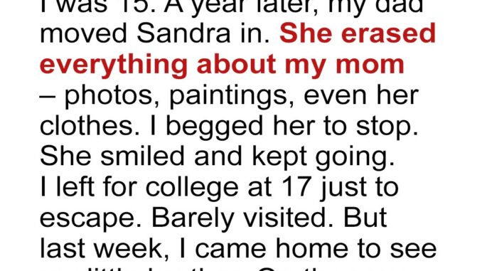 Eden returns home after two years, still grieving her mother who died of breast cancer when she was 15. Her stepmother, Sandra, seemed kind at first but soon began removing her mother’s belongings, which made Eden feel like she was erasing her memory. Hurt and angry, Eden left for college and stayed away.