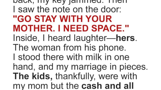 Things took a turn when I came home to find the locks changed and a note telling me to stay with my mom. I was shocked, but the real twist came when his father, Walter, stepped in. He gave me the family lake house and paid for my divorce lawyer, ensuring Arnold paid child support. Meanwhile, Arnold’s new life crumbled—his girlfriend left, and the family business he’d hoped to inherit was taken over by someone else. As for me, I finally found peace, knowing I had Walter’s support, which felt like family.
