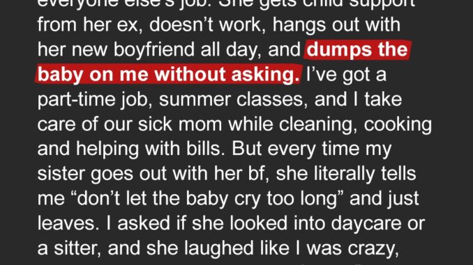 Lena, overwhelmed with responsibility, was constantly babysitting her niece, Rosie, while her sister Abby pursued a carefree lifestyle. Abby, a single mom, would often leave for dates, relying on Lena to step in as a full-time caregiver, despite Lena’s busy schedule and aspirations. Over time, Lena’s exhaustion and frustration grew, and when Abby repeatedly dismissed her boundaries, Lena reached her breaking point.