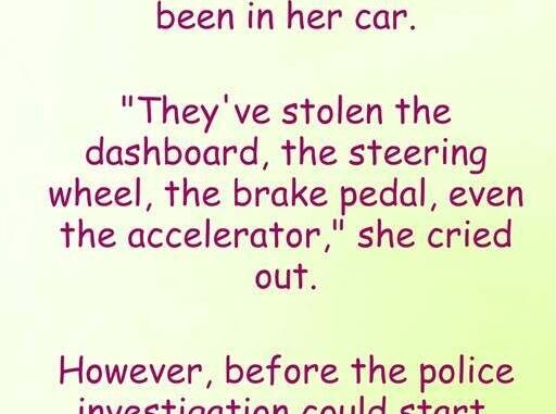 A blonde calls the police, saying thieves stole everything from her car—dashboard, steering wheel, pedals. Minutes later, she calls back: “Never mind, I got in the back seat.”