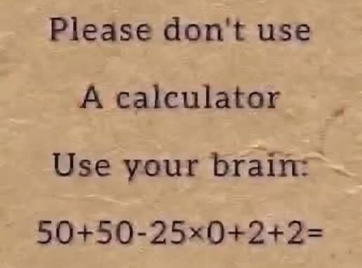 Equation: 50 + 50 – 25 × 0 + 2 + 2
