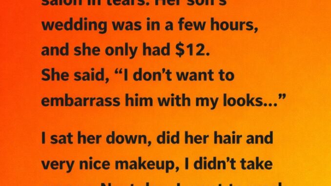 The morning of the wedding was humid, but the woman who entered my salon carried a heavier burden. Her eyes were red, hands trembling, and she whispered that her son was marrying in hours—and she had only twelve dollars. Ashamed of her appearance, she feared embarrassing him.