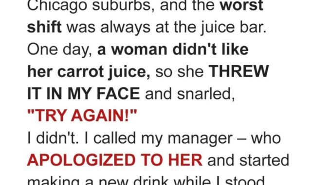 I worked at a health food store, and the worst shifts were at the juice bar. One day, a woman hated her carrot juice and threw it in my face, demanding I remake it. My manager apologized to her and started over while I stood there humiliated.