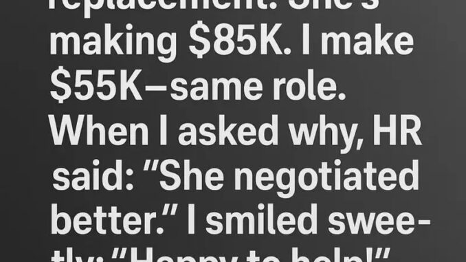My boss made me stay late to train my replacement—she earns $85K, I make $55K for the same role. HR said, “She negotiated better.”