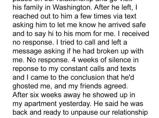 It sounds like you were caught off guard by his request for a “pause.” It’s understandable that, after two years together, you’d be confused by the idea of stepping back instead of just addressing whatever was going on in the relationship.