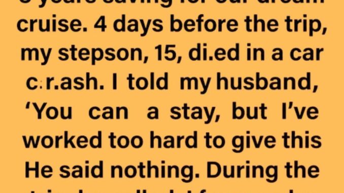 But four days before leaving, everything changed. Her husband’s 15-year-old son died suddenly, and the family was overcome with grief. Everyone expected her to stay, but for the first time, she wondered if she could choose herself.