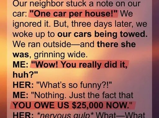 Days later, tow trucks arrived to take both our cars after a complaint. The neighbor watched smugly, clearly behind it.