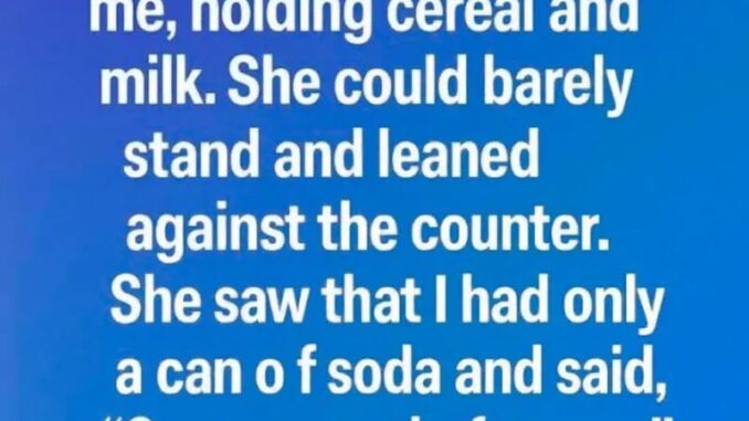 An elderly woman in line ahead of me, holding just cereal and milk, looked fragile but kind. Noticing my single soda, she smiled and let me go first—a small gesture that meant more than expected.