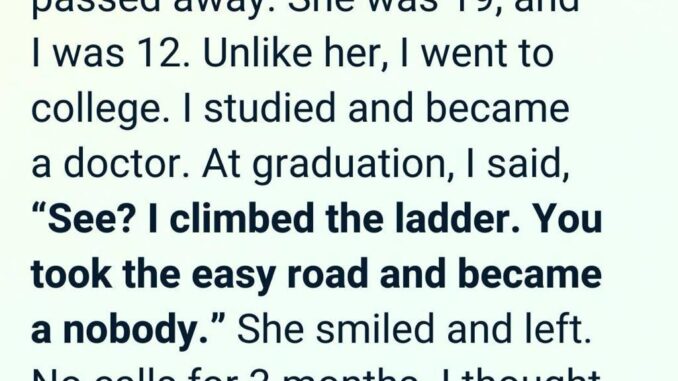 While I focused on school and later my career, she focused on survival. I achieved success, and at my graduation, I made a cruel comment in pride, calling her life “a waste.” She didn’t argue—she simply said she was proud of me.