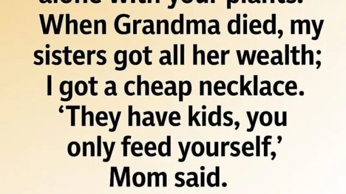 I’m 42 and childfree. My family joked I’d “die alone with my plants.” When Grandma passed, my sisters got the inheritance—I got a cheap necklace. “They have kids,” Mom said. I said nothing.