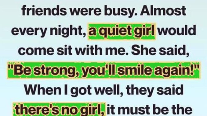 Then I noticed a young girl—about 13 or 14—who began sitting beside my bed every evening. She never spoke much, just kept me company in quiet comfort. Before leaving, she once whispered, “Be strong. You will smile again.” Those words became my anchor.