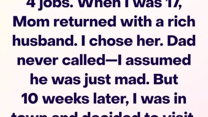 But your father was living a different reality. His version of love wasn’t loud or impressive—it was quiet, exhausting, and constant. Working multiple jobs, coming home broken, still making sure you were okay first. That kind of love is easy to miss when you’re young because it doesn’t look like “success.”