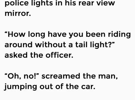 A man gets pulled over for a broken tail light. He panics and jumps out of the car. The officer tells him to relax—but the man cries, “Wait till my family finds out!” When asked where they are, he replies, “In the trailer that was hitched to the car!”