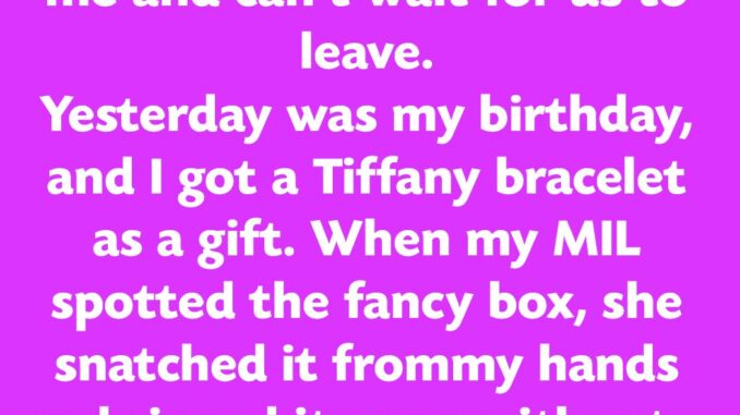 She and her husband are staying with his parents to save money, but her MIL clearly dislikes her and is eager for them to move out. On her birthday, she received a Tiffany bracelet from her own mother. When her MIL saw the box, she grabbed it, tore it open, and exploded, accusing her of wasting money and claiming she deserved the jewelry for letting them live in her house.