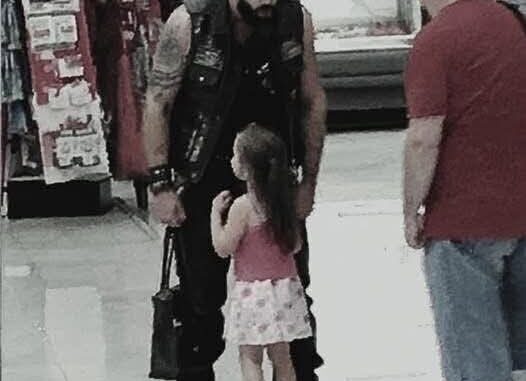 It was a chaotic afternoon at Walmart — carts clattering, people rushing around — when a tiny six‑year‑old girl ran straight into the arms of a tattooed biker in a Demons MC vest.