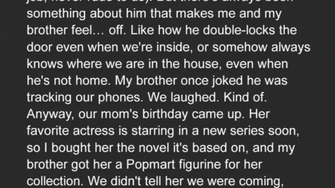 We walked into Mom’s house with birthday gifts, hoping to surprise her. When her new husband Rick opened the door and whispered “You shouldn’t have come,” my stomach dropped — he’d always seemed nice, but his nervousness and constant checking of locks felt odd.