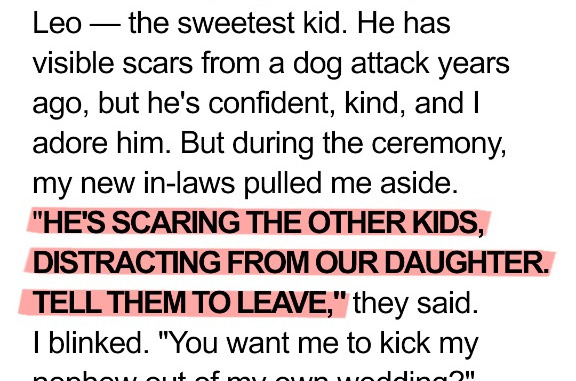 When my in-laws demanded I remove my scarred nephew, Leo, from my wedding because they thought his scars would “scare other children,” it put me in an impossible position. Leo, who was important to both me and my sister, was standing beside me at the altar when they insisted he leave or they would. Hearing this hurt the boy deeply.