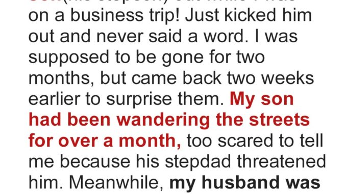 I came home early from a trip expecting a happy surprise, but the house was eerily quiet. My husband’s car was there, but our son was gone. When I called him, my husband—sounding drunk at a party—claimed our son was “staying with a friend to get space,” which didn’t add up. After hours of searching, I finally found our son in a park, gaunt and terrified. He told me my husband had kicked him out weeks earlier, called him a burden, and threatened him if he told me. He had been living on the streets.