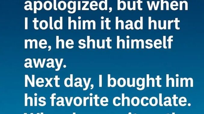 He hugged me and apologized, but when I said it hurt me, he shut down. The next day I bought his favorite chocolate, and he threw it away, saying he didn’t deserve kindness after forgetting something so important.