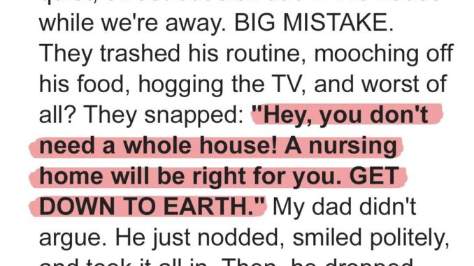 We asked my in-laws to look after my dad’s house while we went on vacation. My dad is a kind man with a long-term illness that requires a calm routine, which we explained in detail. They agreed, but as soon as we left, they threw loud parties, ignored his schedule, and insulted his lifestyle. Worst of all, they suggested he should move into a nursing home.