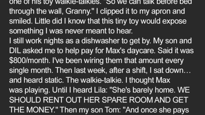 I live next door to my son Tom, his wife Lila, and my four-year-old grandson Max. I even gave them $40,000 toward their home so Max could grow up close to me. Max once gave me a toy walkie-talkie so we could “talk through the wall,” and I kept it on my apron, touched by his thoughtfulness.