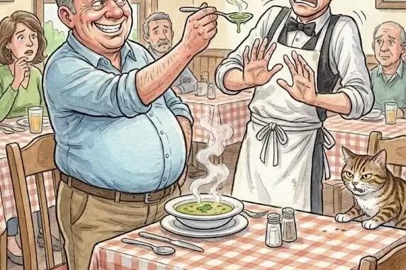 A diner orders a bowl of soup at a restaurant, but quickly realizes something isn’t right. He waves the waiter over.