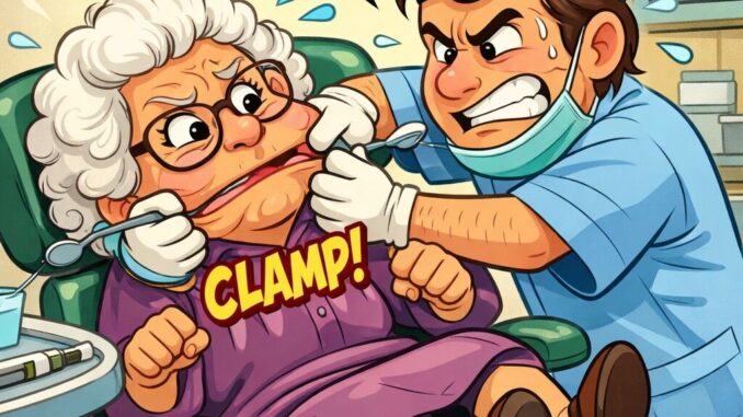 An elderly patient panicked at the dentist, clamping her mouth shut every time he tried to work.