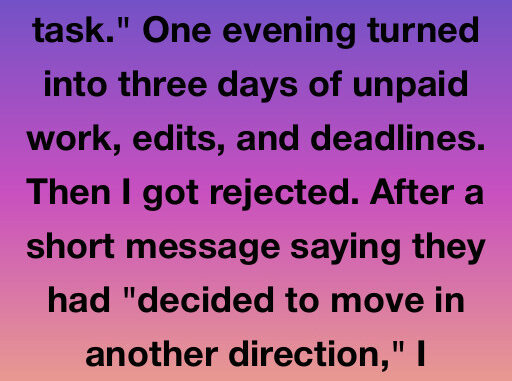 I aced an interview at a trendy Manchester agency, and the manager, Alistair, gave me a “small test task.” It turned into three days of unpaid work: a full social strategy, blog posts, and competitor analysis for a luxury watch brand. I poured my best ideas into it—then got a cold rejection with no feedback.