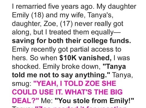 Nathan, 46, has raised his daughter Emily alone since her mother died. Five years ago, he married Tamara, who has a daughter, Zoe. He worked hard to treat both girls fairly — family dinners, shared vacations, and separate college funds. Emily’s fund was built over years of sacrifice; Zoe’s was newer but growing.